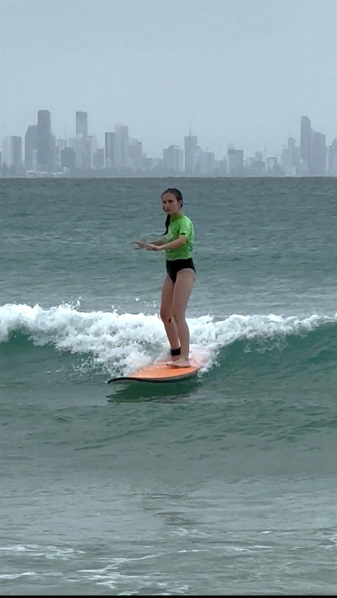 Saturday Deb and Allan took me, their granddaughter, and their grand-nephew out to go for a surfing lesson near Surfer’s Paradise. I must admit a lot of it was more enjoyable in hindsight than during the experience, mostly because the water was insanely salty and kept getting in my eyes and burning so much and so painfully I was near blind for most of the hour and a half we spent in the water. My eyes are actually burning right now as I’m writing this just from the memory. Other people were fine though, so it’s apparently just my delicate constitution – turns out one isn’t quite completely used to the ocean when it’s their third time total in it; go figure. That said, I was completely fine when I was throwing myself at the waves earlier in Jan Juc, so what gives? That all got very easy to gloss over, though, when I actually managed to surf standing up all the way to shore at the end of the lesson. Yay for me! I definitely want to try again!